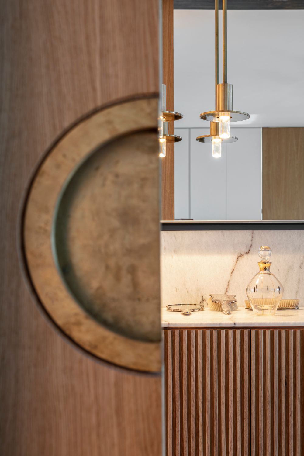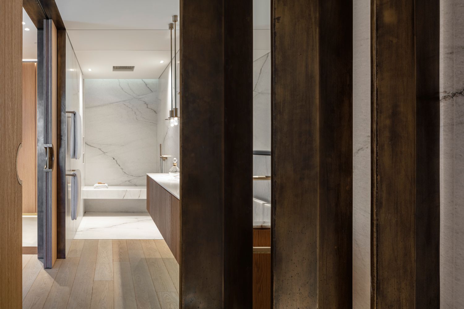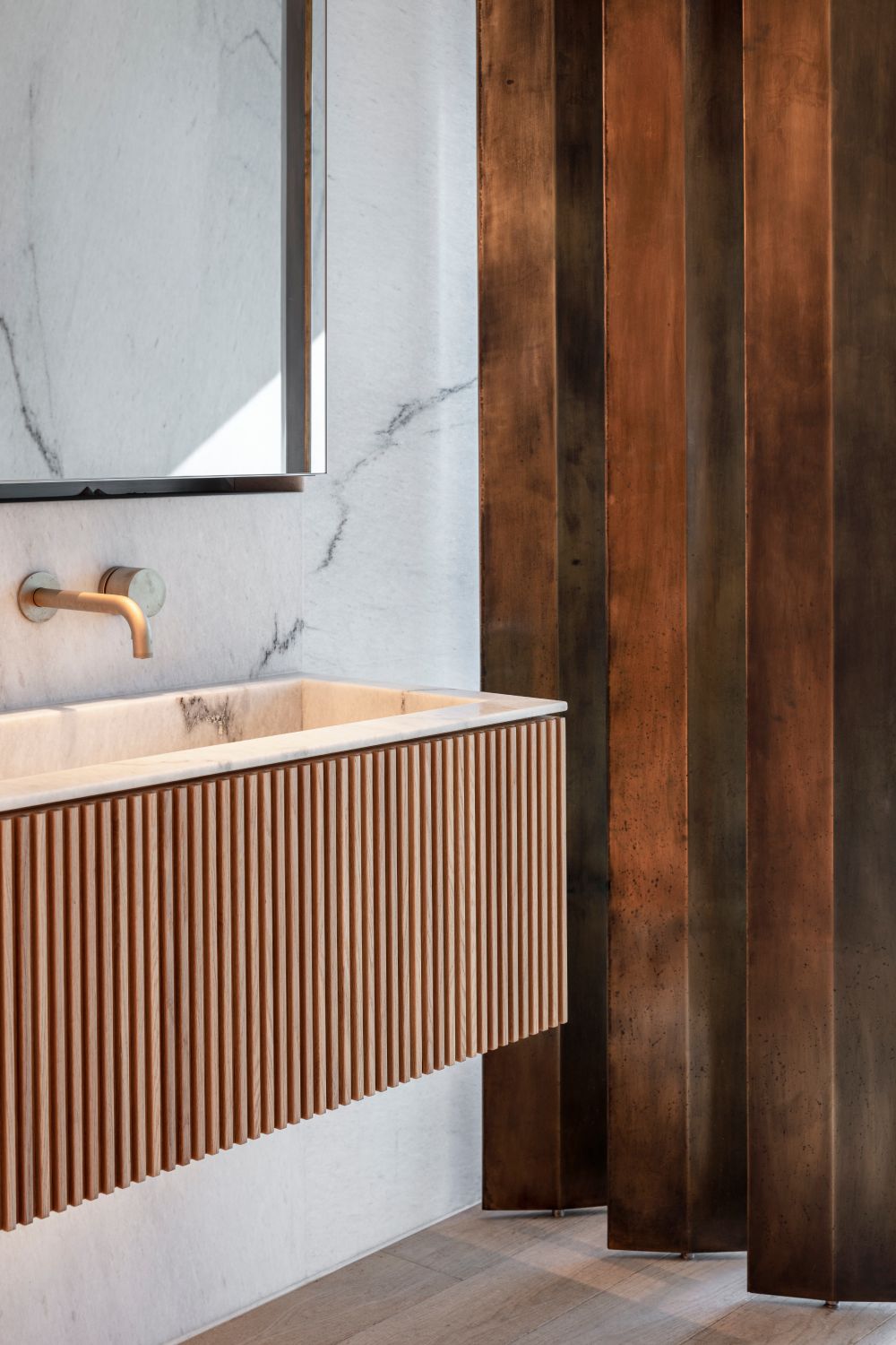 חדר רחצה עם מחיצות על גבי ציר ואלמנטים בעבודת יד עשויים מברונזה
