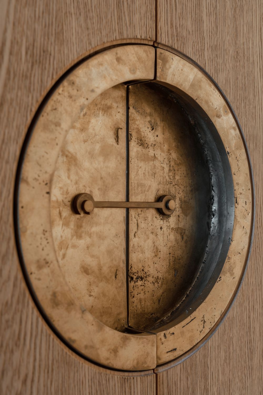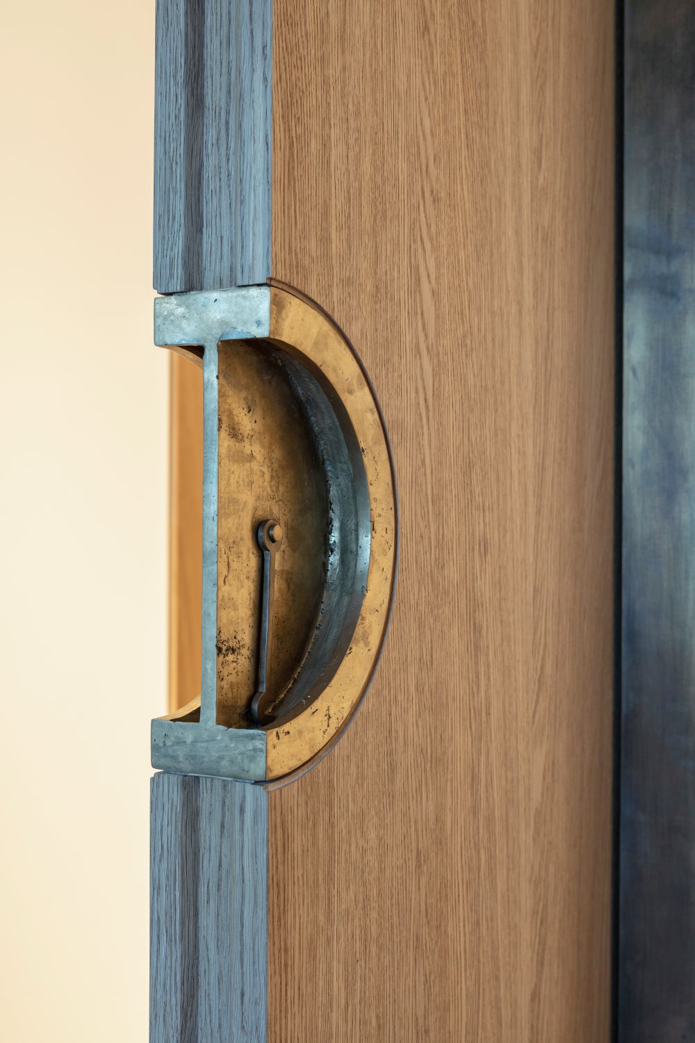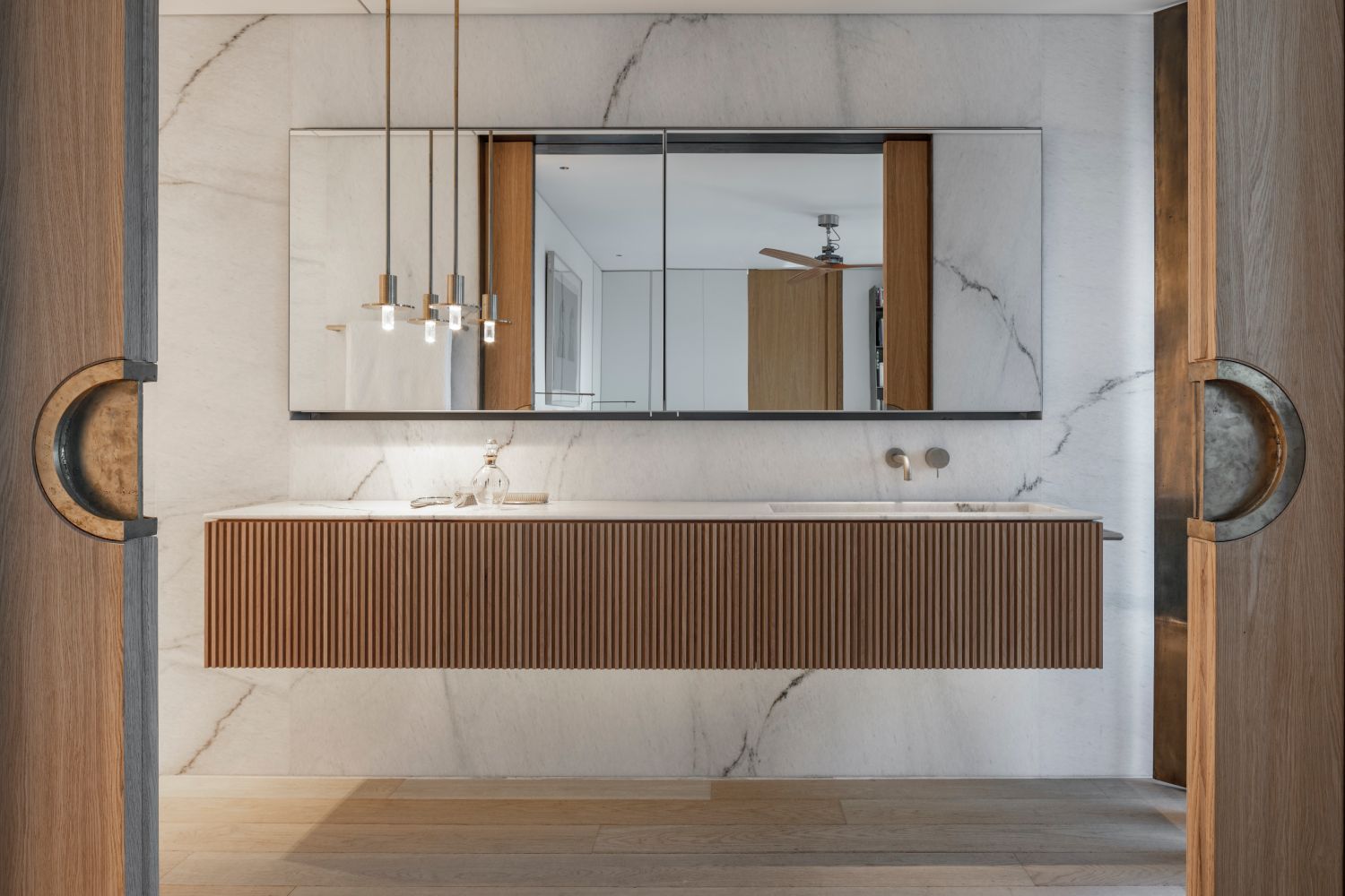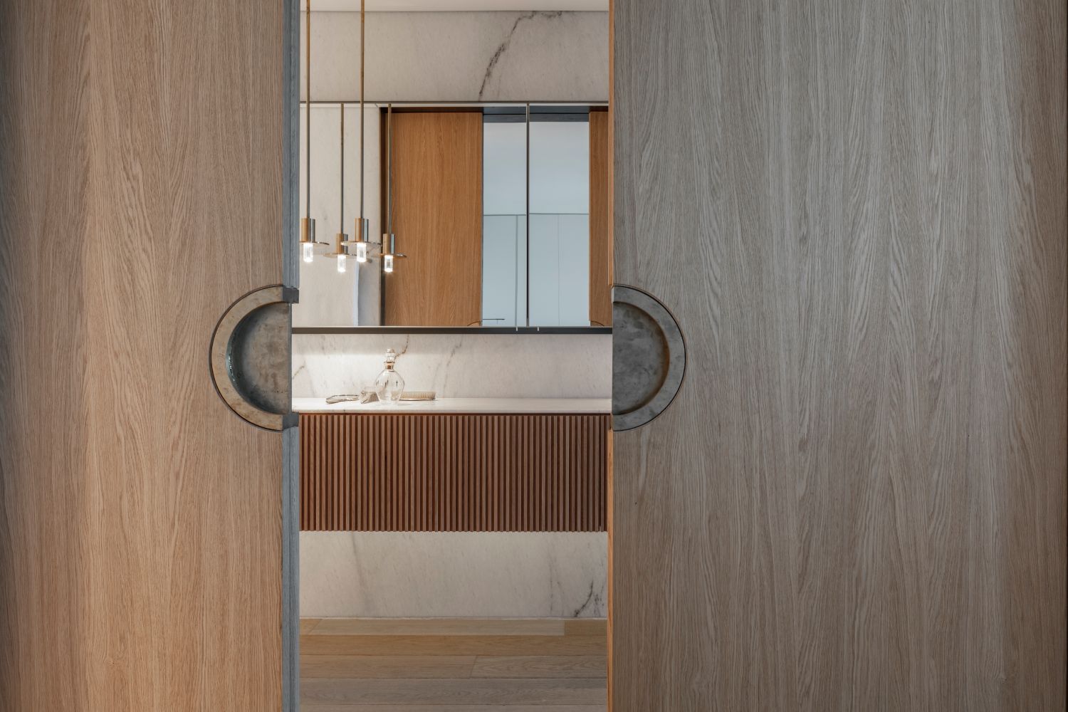 חדר רחצה עם מחיצות על גבי ציר ואלמנטים בעבודת יד עשויים מברונזה