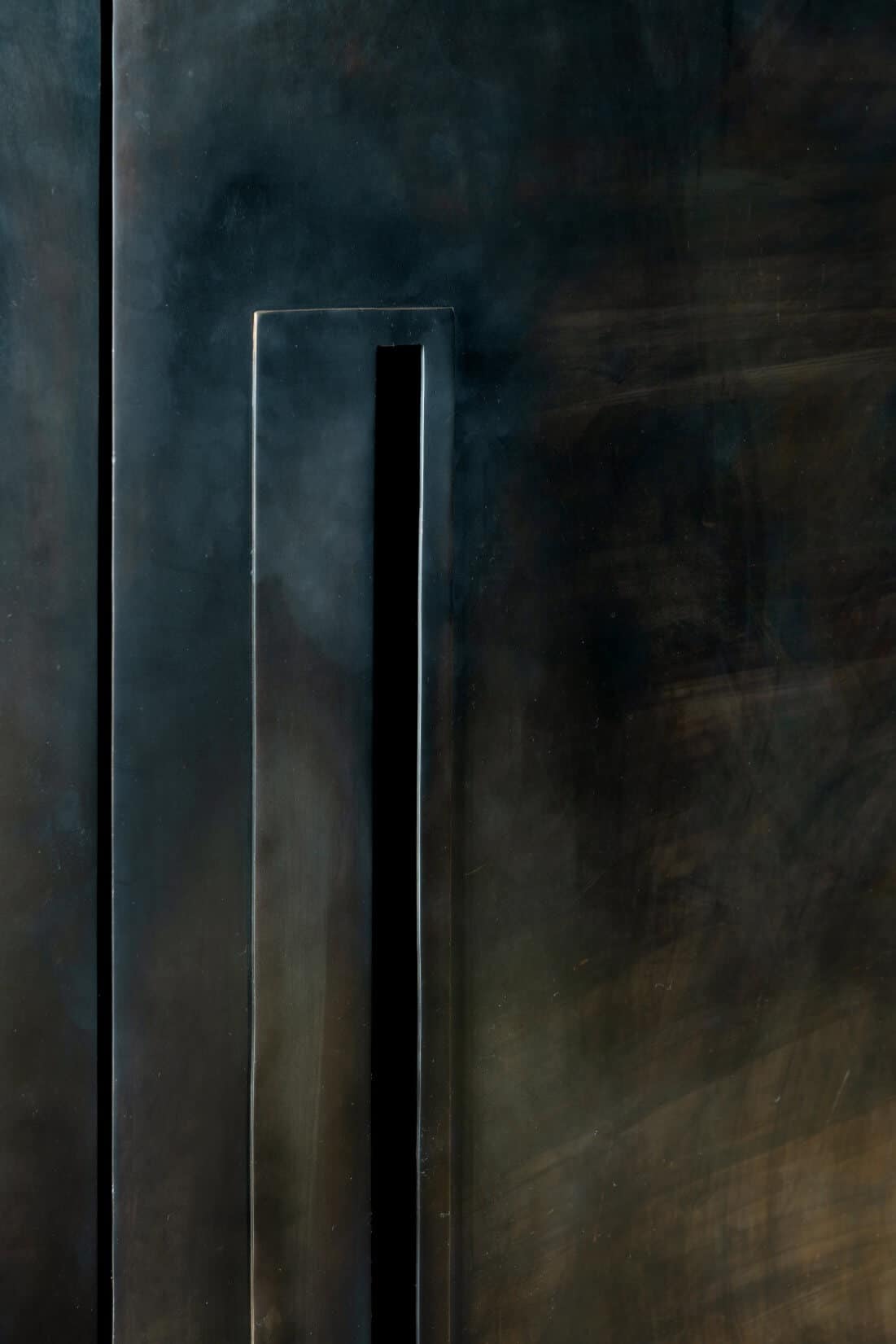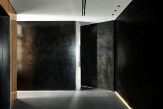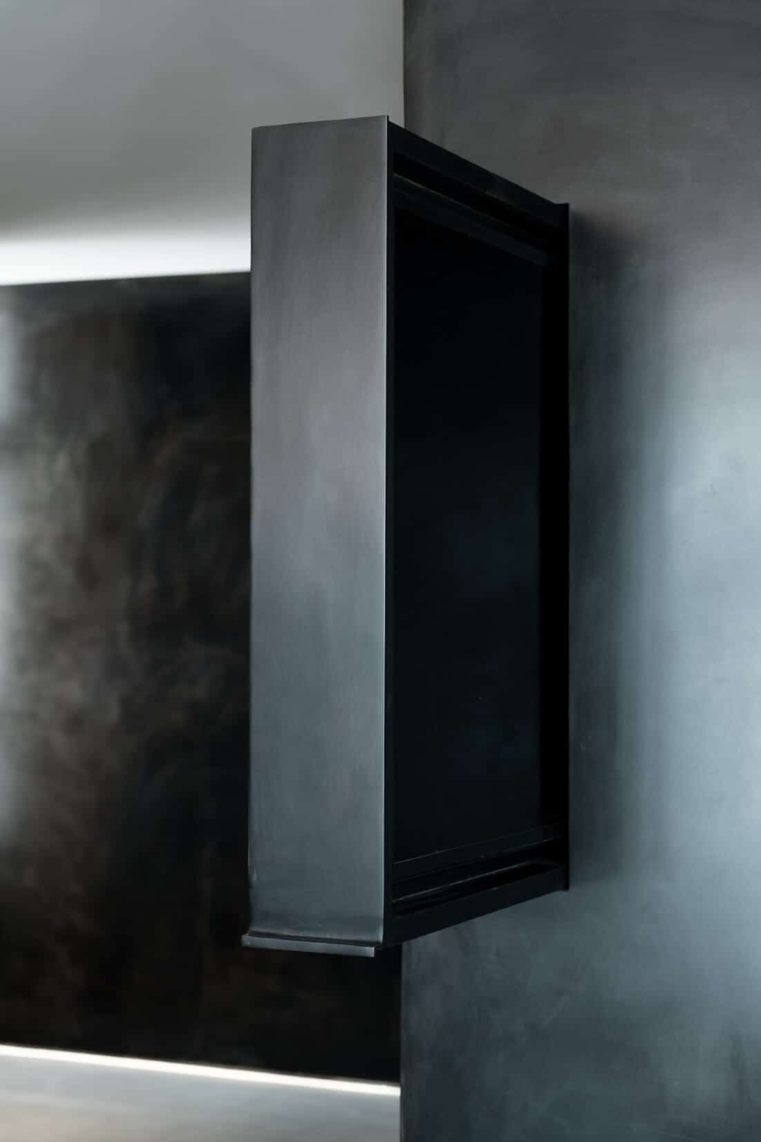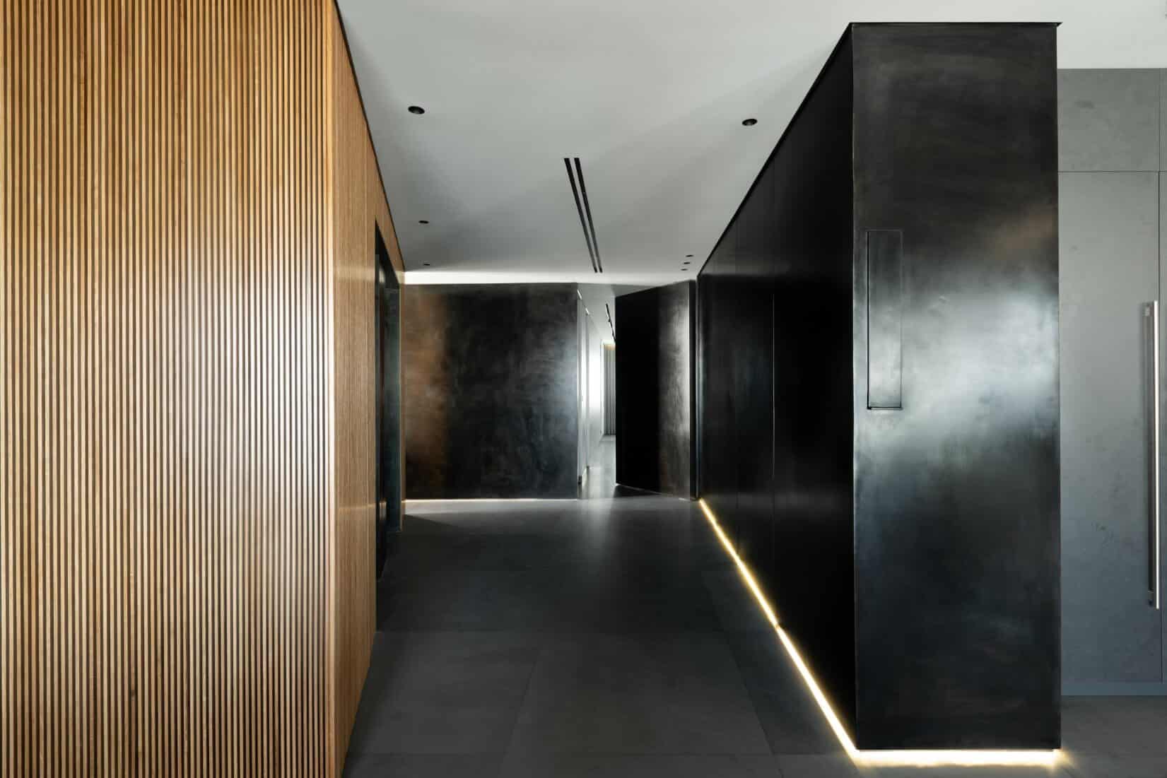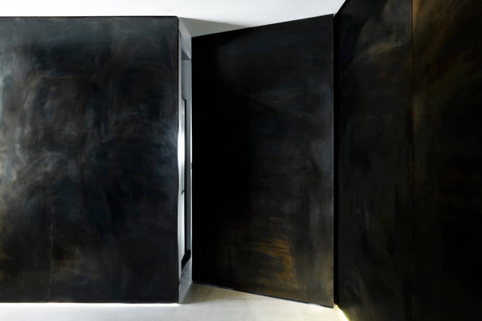 כשכל הדלתות במצבן הסגור, המבואה עטופה בפלדה מושחרת במראה מרחף (הודות למרווח שהשארנו בין הפלדה לרצפה), ויוצרת סדר ורוגע עבור הנוכחים בה.