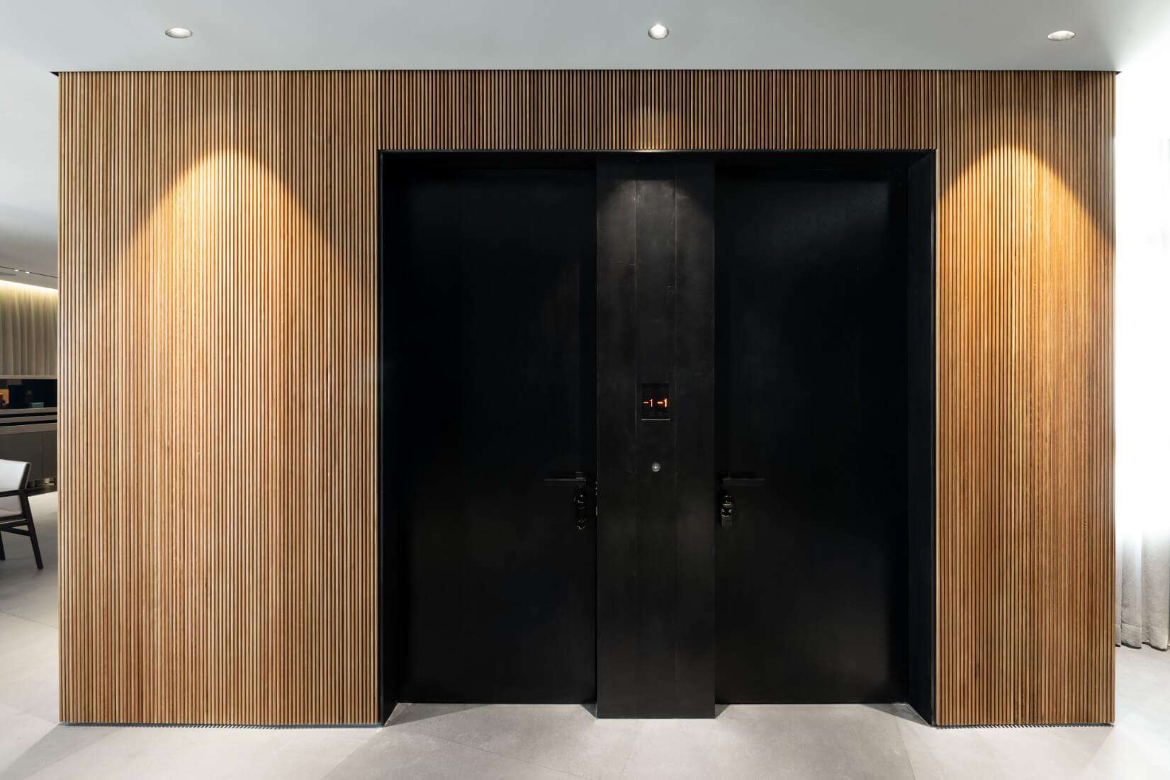 עשינו שימוש בחומר הומוגני וחלק ככל האפשר, עמו חיפינו את הקירות, עיצבנו דלתות ובניהן דלת פיווט ייחודית עבור המעלית, שמנגנון הפתיחה שלה לא בא על חשבון רוחב הדלת.