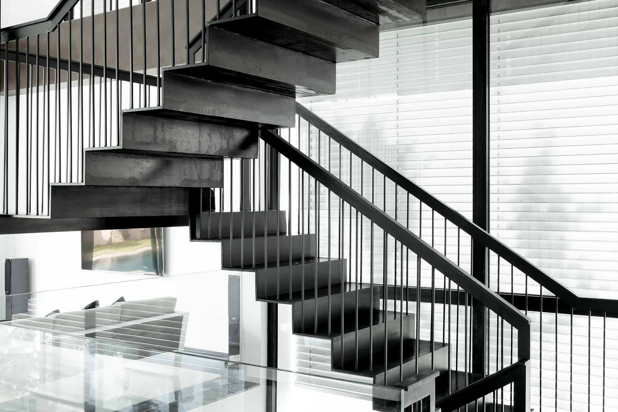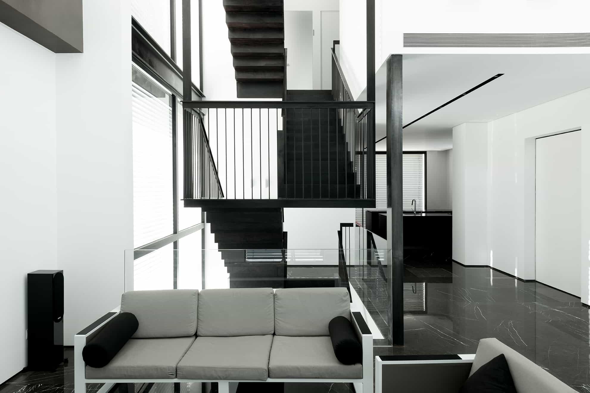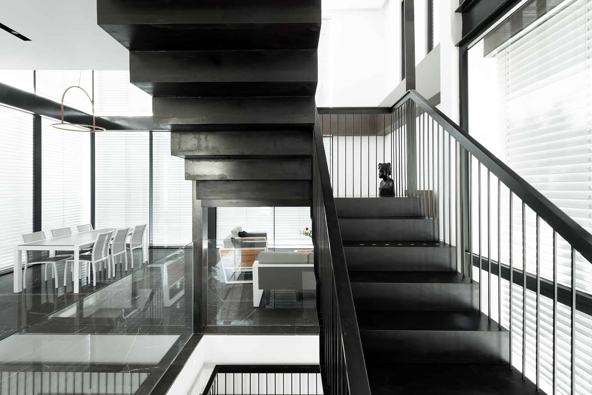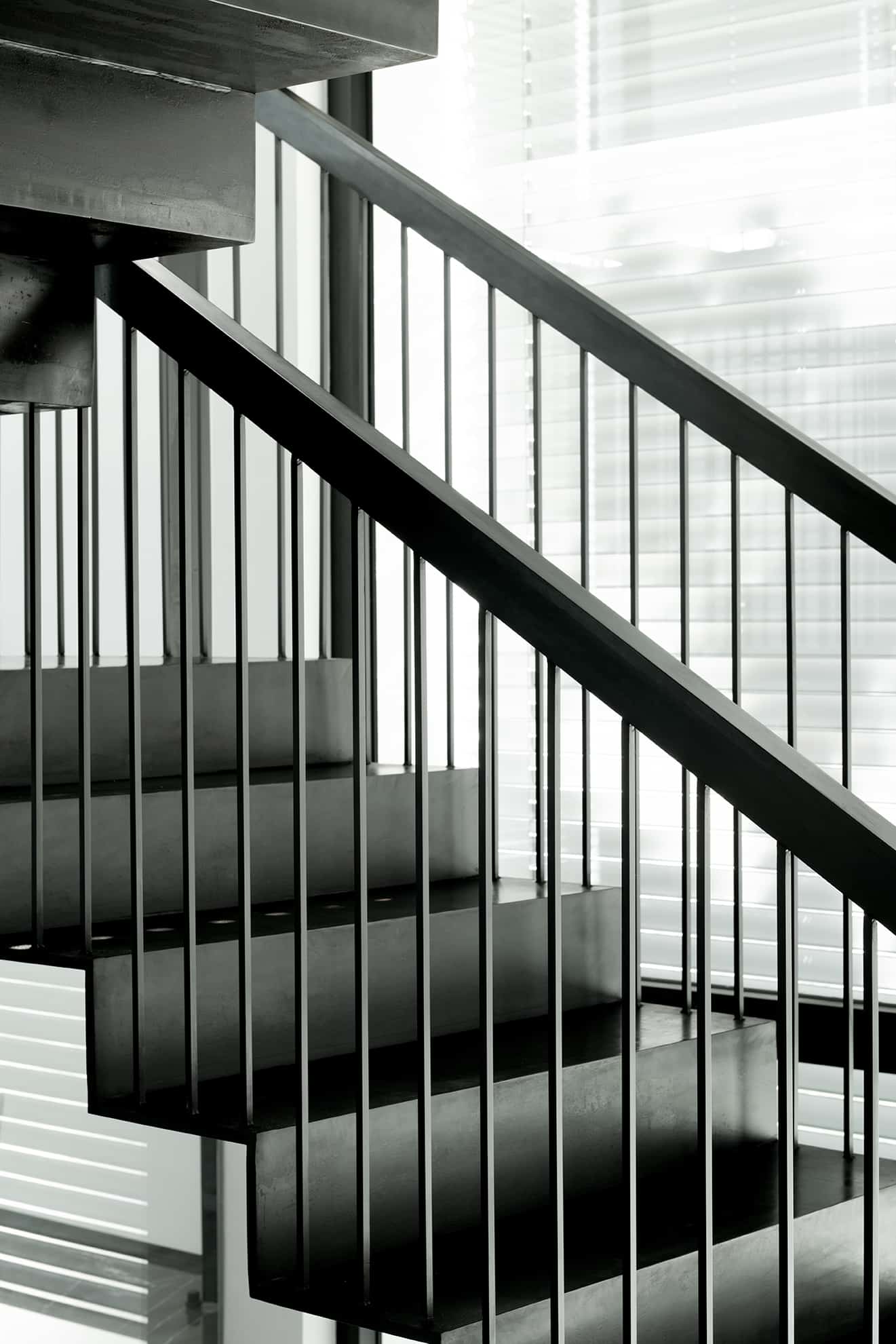 בית פרטי עבורו התבקשנו לעצב ולתכנן גרם מדרגות המחבר בין מפלסי הבית. בקשת הלקוח הייתה שנעצב את גרם המדרגות כאלמנט דומיננטי במרכז הבית, שרואים מהחללים השונים בו. לכן עיצבנו גרם מדרגות במסה גדולה, מפלדה מושחרת בעובי 15 מ"מ, בעלת נוכחות רבה. שני מהלכי המדרגות העליונים נתלו מהתקרה, כדי לשמור על אסתטיקה נקייה, ללא עמודים וללא חיבורים, עם מעקות שקופים ועדינים. מהלך המדרגות התחתון, מונח על גבי ספרייה, שגם אותה עיצבנו מפלדה מושחרת במראה דומיננטי אך נקי.