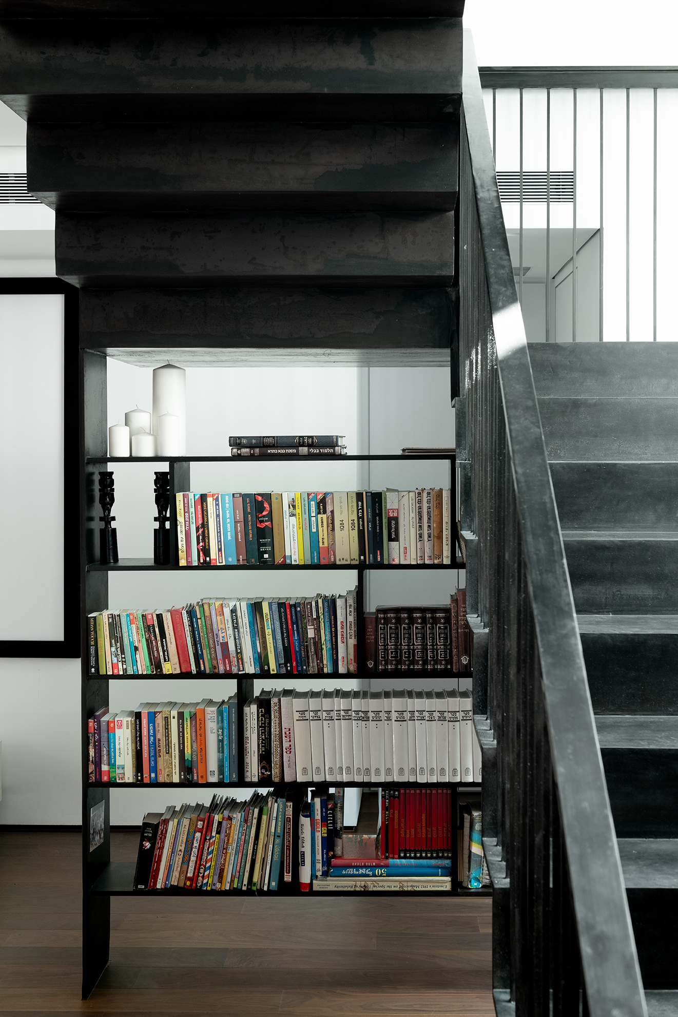 מדרגות וספרייה מפלדה מושחרת בדירה