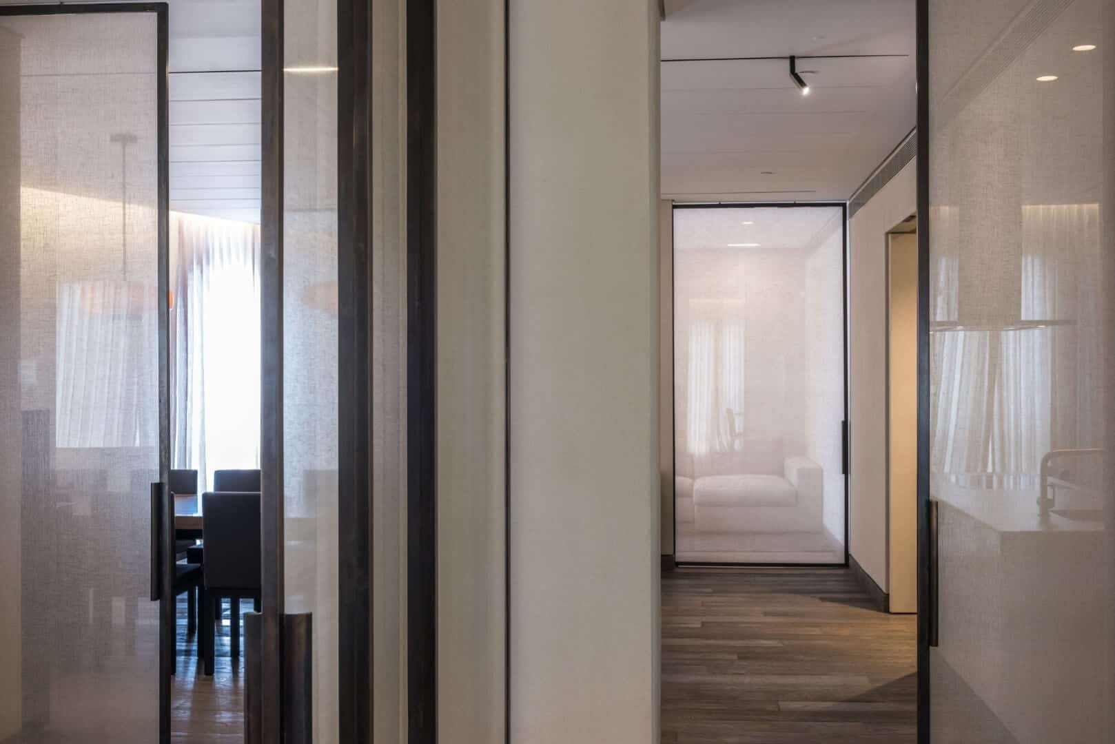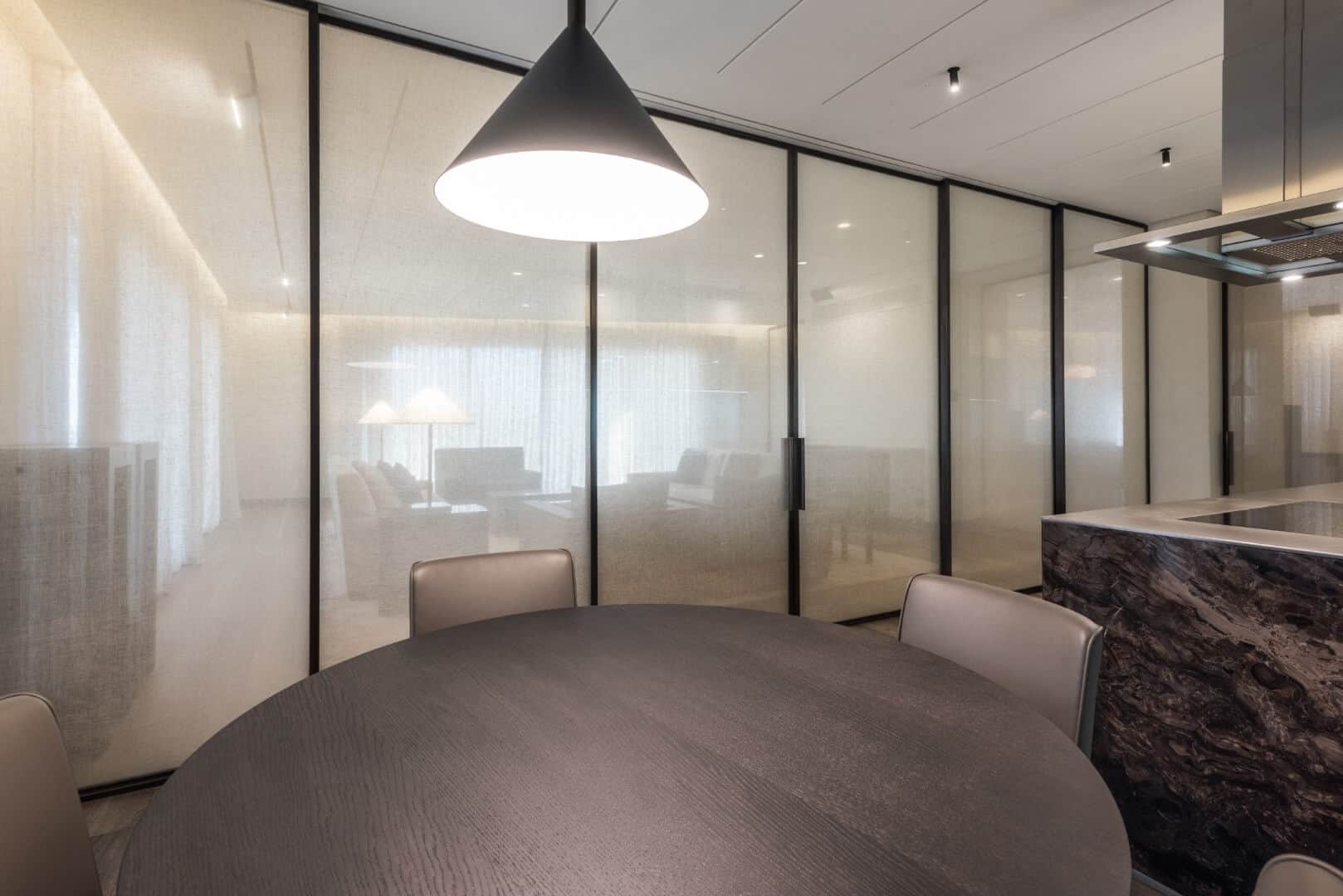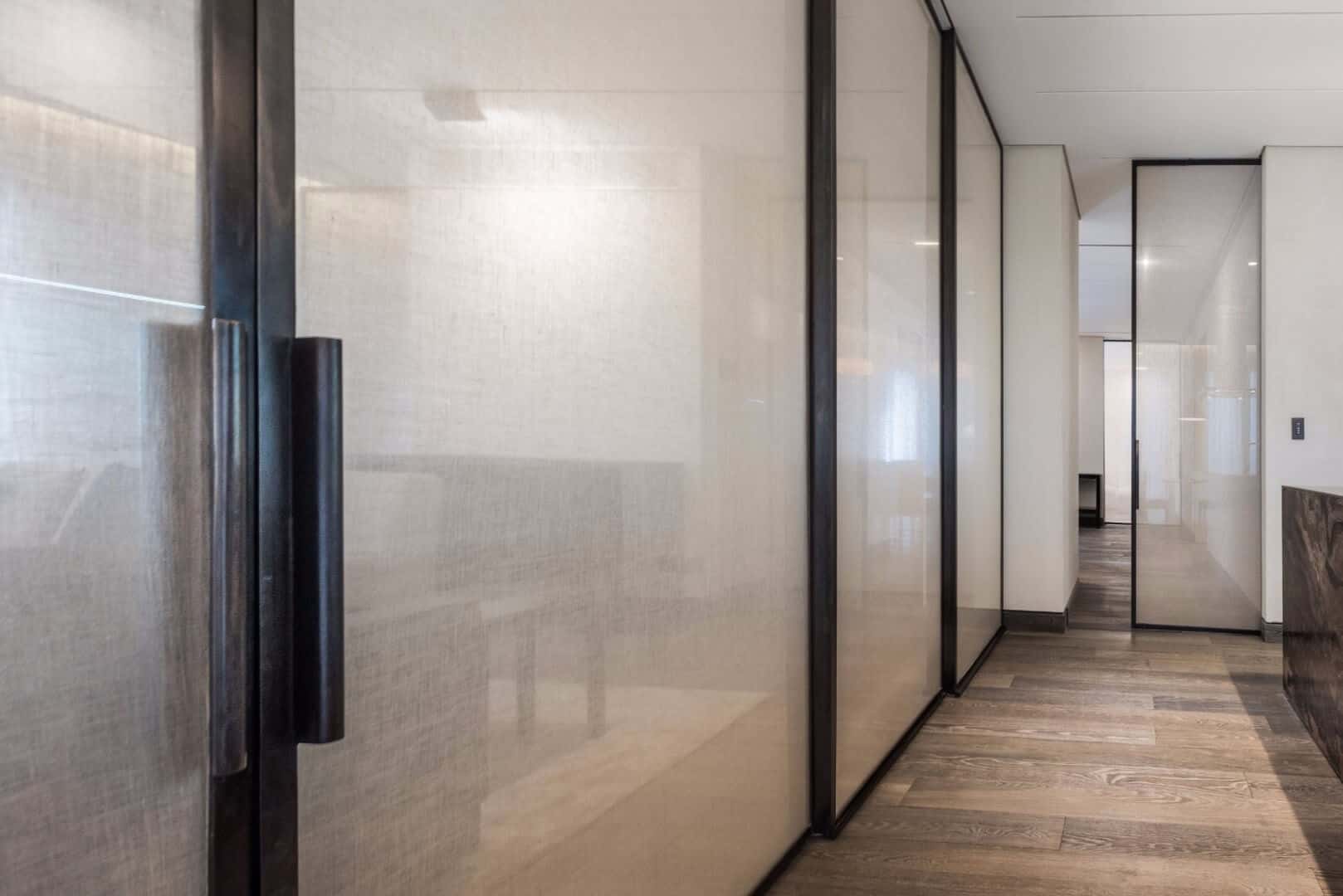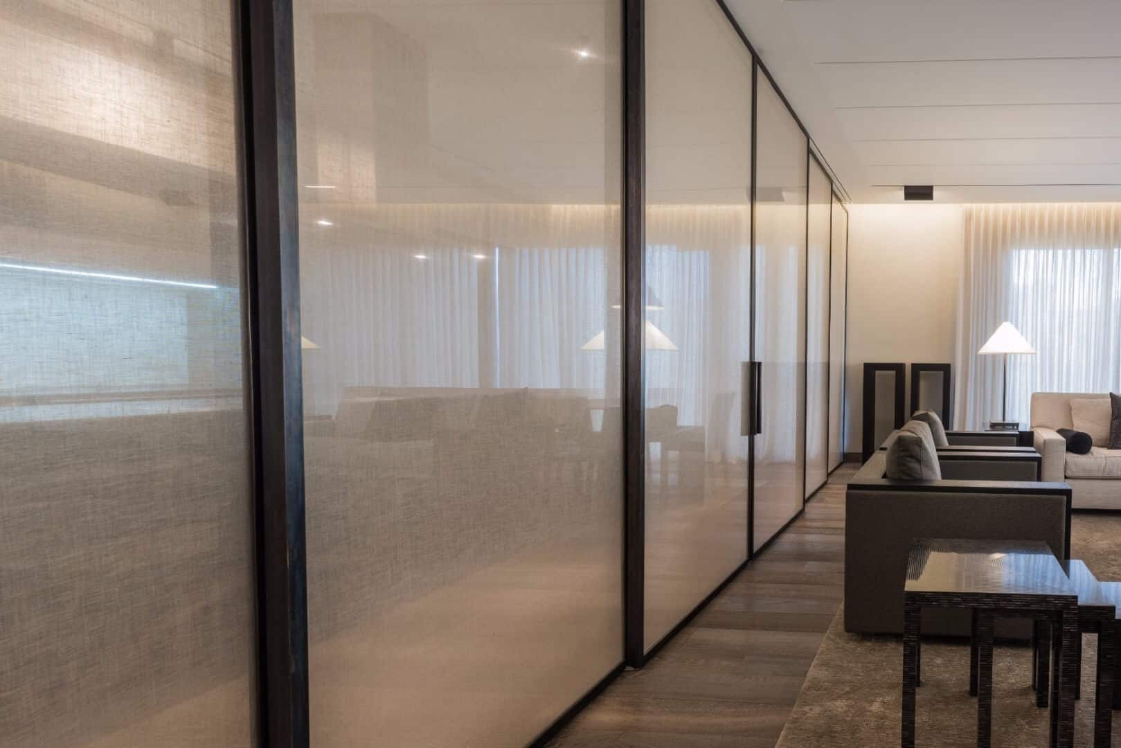 In this project, all of the doors in the penthouse were designed from blackened bronze, from the entry door to the interior doors. The challenge in this project was to create doors at the exceptional height of three meters, with only upper tracks. We designed particularly thin, custom-made profiles in order to maintain an elegant style.