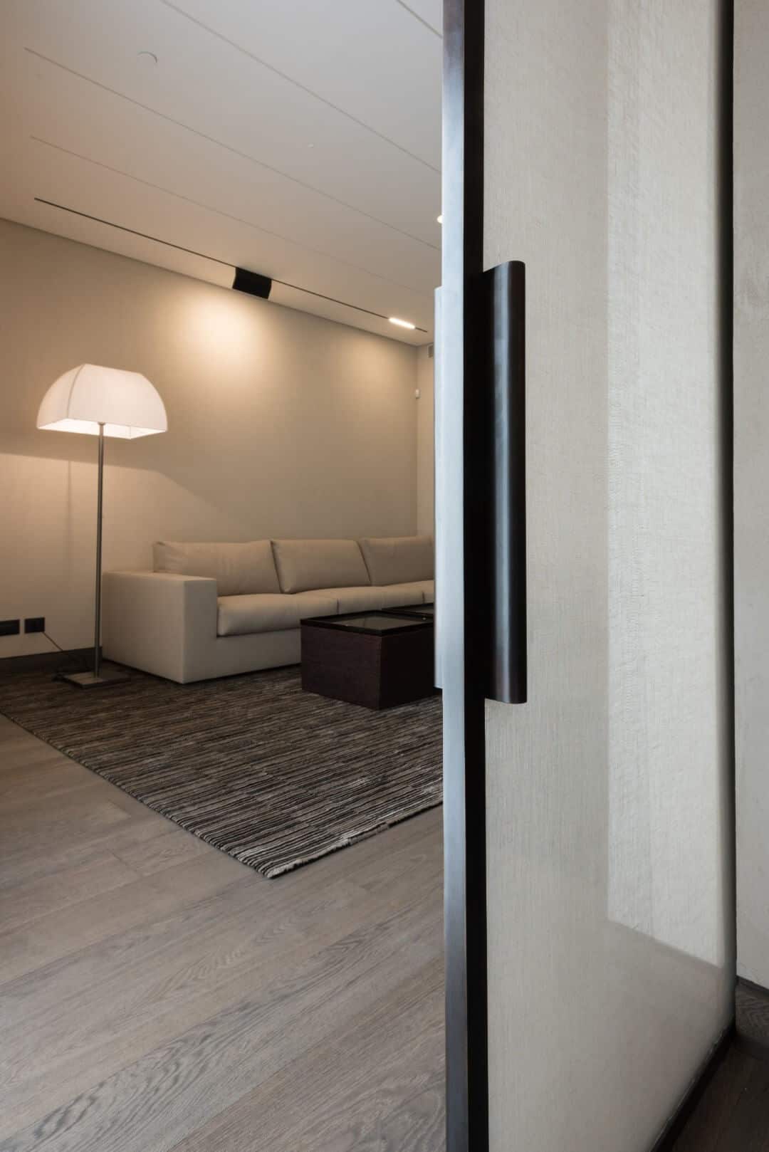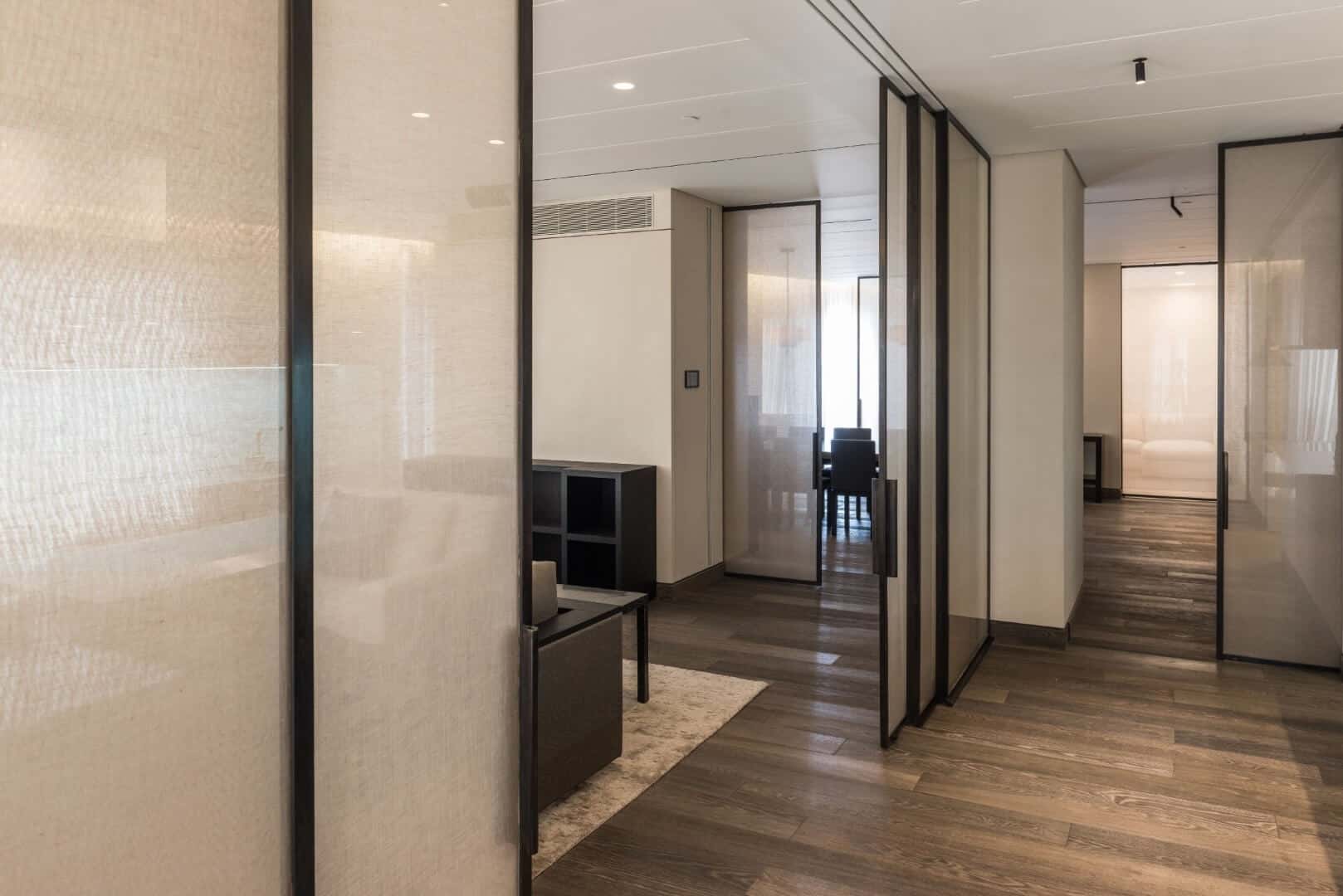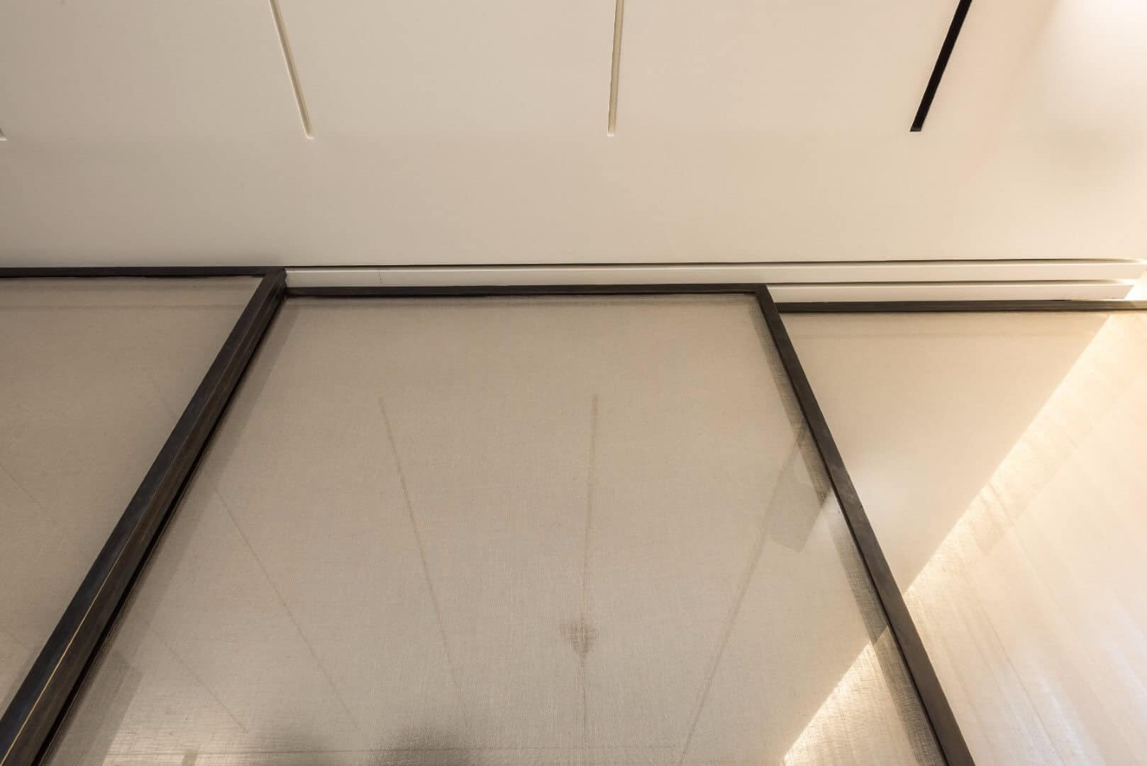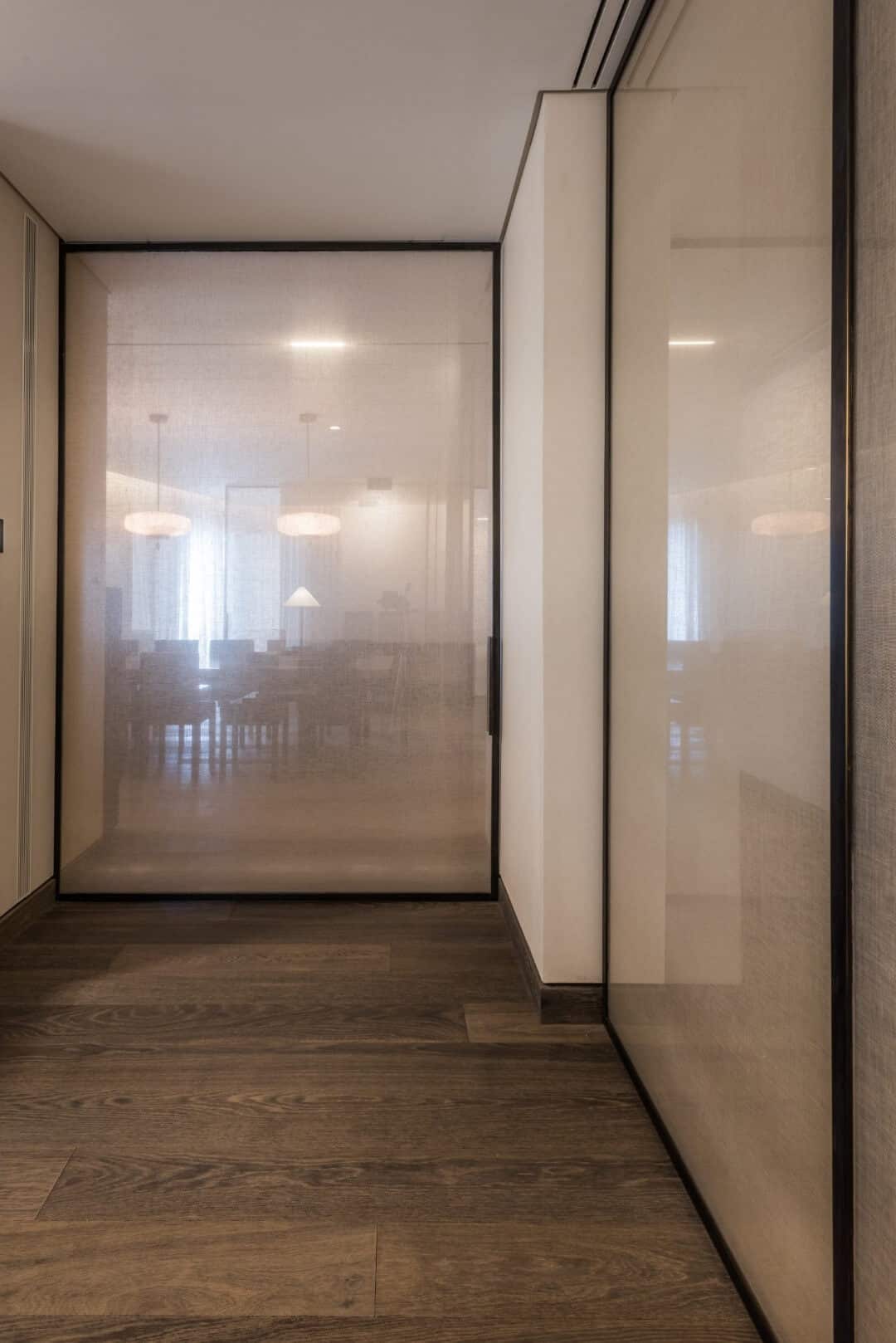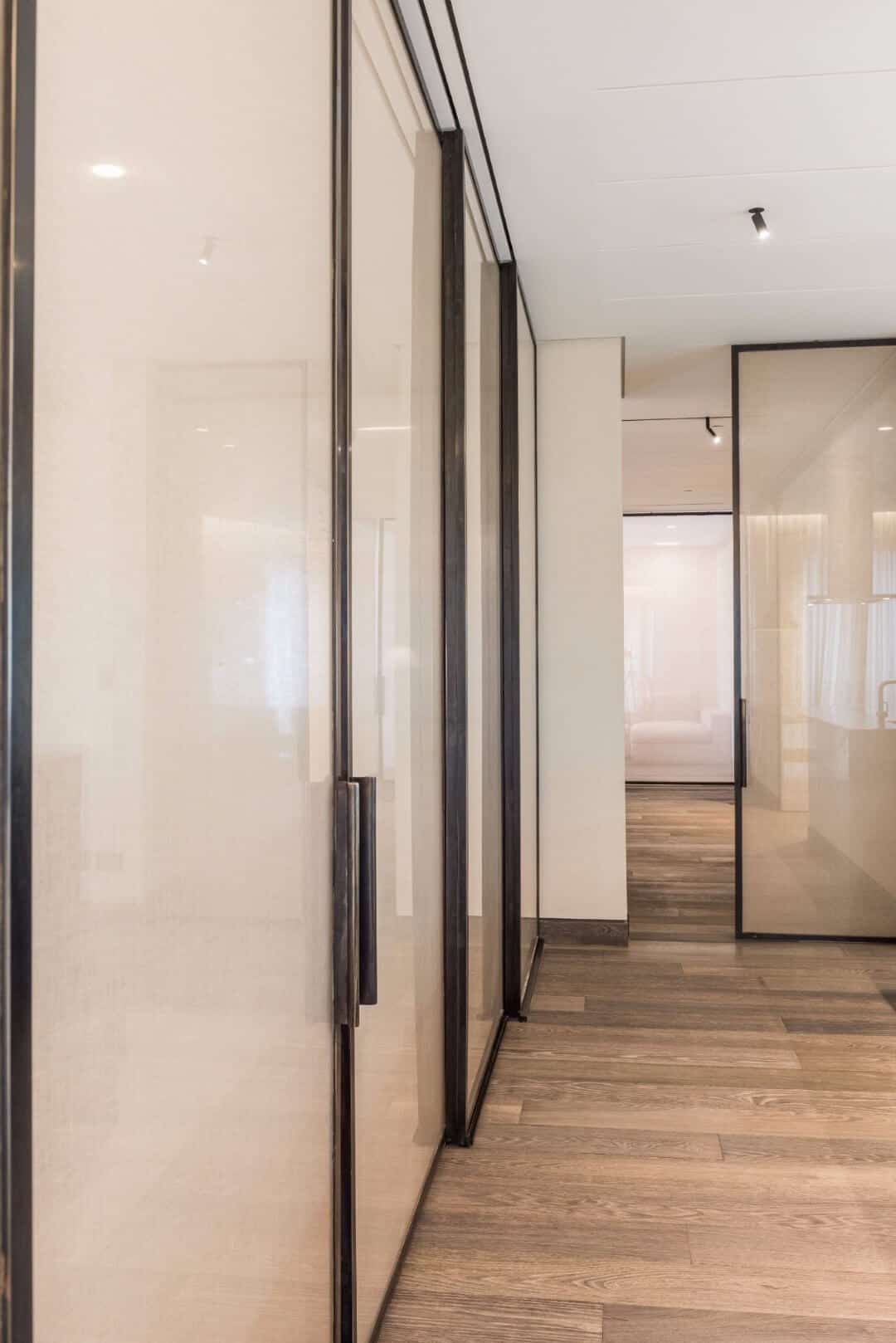In this project, all of the doors in the penthouse were designed from blackened bronze, from the entry door to the interior doors. The challenge in this project was to create doors at the exceptional height of three meters, with only upper tracks. We designed particularly thin, custom-made profiles in order to maintain an elegant style.